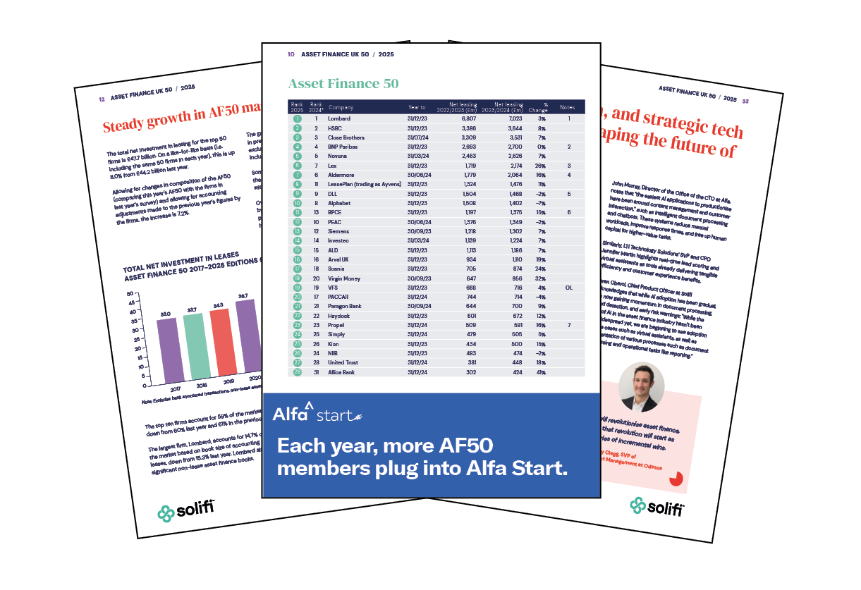 Sponsored by News Discover the UK’s top 50 asset finance firms in AFUK50 2025 Published: 1st July 2025 Share Download the 10th annual edition of the definitive industry ranking – exclusively from Asset Finance Connect and Asset Finance Policy – and sponsored by Solifi. What’s inside the AFUK50 Report 2025? The Asset Finance UK 50 (AFUK50) Report identifies and ranks the top 50 UK asset finance providers by net investment in business equipment leasing. Now in its landmark tenth edition, the report offers unparalleled insight into the UK asset finance market during a year marked by both economic headwinds and renewed growth. This year’s report highlights: AFUK50 ranking by net investment in business equipment leasing Fastest-growing independent lenders revealed Market segmentation by type of lender and ownership location Top performers by key financial indicators Expert commentary from leading industry figures Key highlights from the 2025 AFUK50 Report show that the total industry book size rose to £47.7 billion, representing an 8.0% year-on-year increase. Of the top 50 firms, 40 either maintained or expanded their portfolios, while 24 achieved double-digit growth. As UK businesses and consumers navigate ongoing economic challenges, the asset finance sector is showing steady resilience and a gradual shift away from bank-owned lenders toward independents – often more agile in times of elevated credit risk. Julian Rose, director of Asset Finance Policy and compiler of the AF50 UK data, said, “This is the tenth annual edition of the AF50, and although there’s been limited change at the top-end of the market over the ten years besides the exit of Barclays, further down the table there are many new names, with one in four firms having joined the index since the first edition. The AF50 shows the highly competitive and diverse nature of the market, with total lending split between different types of bank and non-bank lenders owned in the UK, Europe and elsewhere.” Why the AFUK50 matters Since its first edition in 2016, the AFUK50 has become the go-to annual reference for lenders, investors, regulators, suppliers, and analysts. It is compiled from audited, publicly available data to ensure full compliance with competition and disclosure regulations. The 2025 edition reflects a dynamic and evolving industry – embracing change, responding to challenges, and continuing to power the UK’s real economy. Download your copy of the Asset Finance UK50 Report 2025 today. Download report