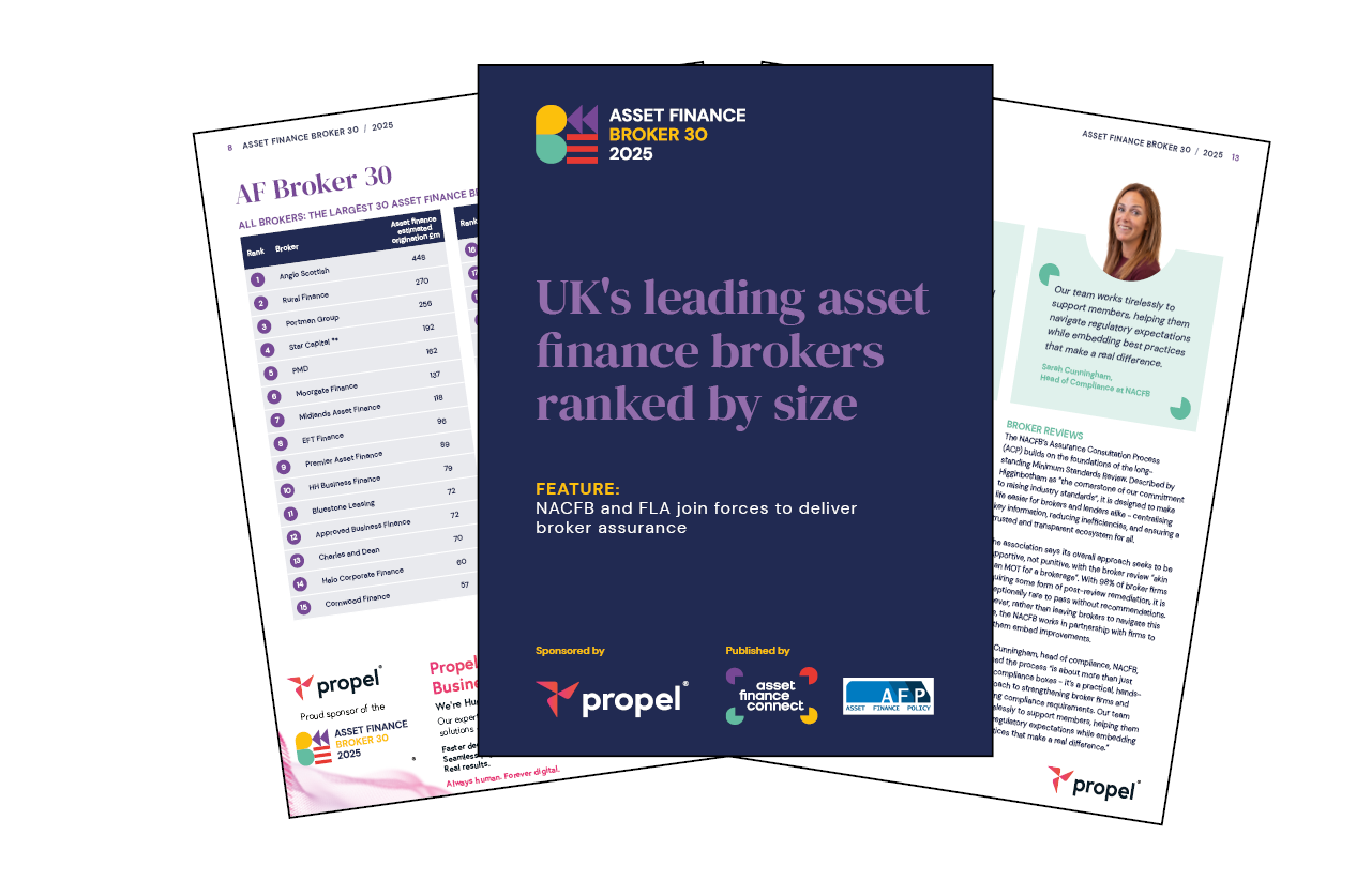News Top 30 UK asset finance brokers revealed in inaugural AF Broker 30 report Published: 1st July 2025 Share Sponsored by: The Asset Finance Broker 30 Report 2025, sponsored by Propel Finance and published by Asset Finance Connect in collaboration with Asset Finance Policy Ltd, is the first comprehensive ranking of the UK’s top 30 asset finance brokers by leasing volume. Brokers play a vital role in originating over £7 billion of SME asset finance annually – around 30% of the total business leasing market. Yet until now, little has been published about the firms powering this essential channel. The AF Broker 30 fills that gap, offering new transparency, detailed rankings, and expert commentary. What’s inside: AF Broker 30 ranking table – The 30 largest asset finance brokers by leasing volume Specialist broker rankings – Top firms focused primarily on asset finance Editorial features – Insightful articles on broker-lender relationships, digital transformation, commission disclosure, and more Interviews – Perspectives from the NACFB, Close Brothers, Propel Finance, and industry leaders Why download?Whether you’re a lender building your panel, a broker benchmarking your performance, or an investor seeking market intelligence, the AF Broker 30 Report provides essential insights into one of the most dynamic areas of UK commercial finance. Download your copy of the Asset Finance Broker 30 Report 2025 today. For more information or to inquire about future editions, contact Lisa Laverick at lisalaverick@finance-connect.com or Julian Rose at julian@assetfinancepolicy.co.uk Download report