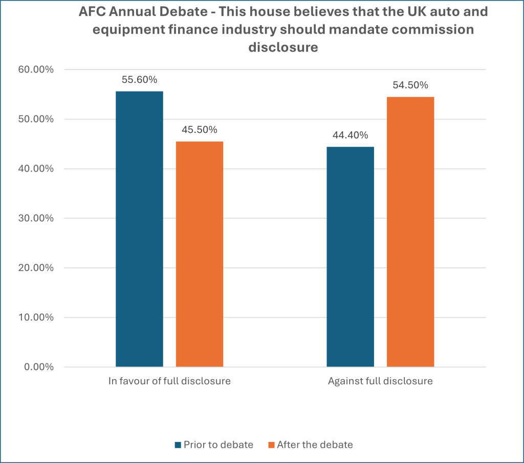 Conference Reviews AFC Annual Debate: pros and cons of mandatory commission disclosure Published: 19th September 2024 Share This year’s AFC summer conference featured the first ever AFC Big Debate, sponsored by NETSOL Technologies, with two teams of experts arguing the pros and cons of mandatory commission disclosure and battling it out to win the votes of their audience. Debate chair Jason Hurwitz, sales director Europe at NETSOL Technologies, explained the aim was to “flush out all sides of a real and tangible industry issue so they can be discussed without fear or favour.” An initial poll via the AFC app found a narrow margin between the two opposing views, with 55.6% of the audience in favour of compulsory disclosure and 44.4% against. But as Hurwitz pointed out “make no mistake – it’s a competitive debate and the winner is the side which sways the audience views the most. The speakers are not allowed to sit on the fence”. PETTS First up was John Rees, AFC’s community head, equipment finance, speaking in favour of the motion. On what he labelled “a day of acronyms” Rees added one more: PETTS, which he described as “warm, cuddly and furry”. The elements of PETTS are professionalism, which must be evident the whole time in all aspects of work, particularly with regard to the borrower understanding all the economics of a transaction, followed by being ethical in dealing with people’s ability to borrow and use that lending to buy assets. Next comes transparency – how can customers be convinced they are receiving a value for money service if they are not aware of all the financial elements of a transaction? That links directly to trust, with customers unable to trust the commercial relationship if there is not total transparency around commission. “And most provocatively the final element is self regulation. We are a professional, transparent and ethical business. If we wait for the FCA to impose something on us, we don’t know what that will be, but we do know for sure it will never be changed. Therefore, it’s incumbent on us to control our own industry and self regulate,” Rees declared. Full disclosure Having stated “all I want you to do is think of your PETTS,” Rees gave the floor to David Betteley, AFC head of content, to advance the alternative point of view. Betteley sought to clarify the grounds for debate, pointing out that commission disclosure for regulated agreements has been a principle for many years. The crucial point is around full commission disclosure, which means confirming not just the existence of any commission but also the actual amount. “There have been lots of surveys about this, including by major dealer groups, and they’ve all found that the number of customers who ask about the amount paid is infinitesimally small. There isn’t any real interest from customers in finding out,” Betteley explained. Instead, the customer typically has three concerns about any deal: the price of the goods, and the possibility of a discount; the part exchange allowance; and the size of the monthly payments. “There are many examples where the customer negotiates a £2000 discount, and the commission paid is £1000. So, they are happy with the overall structure of the deal. The commission is important, but it’s not the deciding factor,” Betteley pointed out. Many auto finance agreements are already very heavily regulated, with lenders and dealers required to provide information on the cost, deposit, balance to finance, fees, APR and monthly payments. “But all the surveys show customers don’t use APR to compare and they don’t understand it. People under 25 have an even lower knowledge of APR than older people. I’d say there’s a definite comparison between the APR and the amount of commission – customers just don’t take it into account. They look at the overall deal,” Betteley argued. And it’s the additional service from dealers which is typically priced into the package that customers seem to value, with online-only options such as Cazoo rejected in favour of an omnichannel approach. Storybook lending In the asset finance sector, brokers are dealing with clients with a wide range of credit ratings. Customers with a lower credit rating are more difficult to place with a lender and can require extra work if, for example, five years of accounts are required rather than one. “You tell a story to the lender and that takes a lot of time, a lot of work and a lot of skill and it seems only fair to me that that is rewarded by payment of commission. I don’t think the amount of that commission is a deciding factor for consumers, and perhaps the concern lies more with the trade associations and the regulators,” Betteley declared. He went on to caution about the unintended consequence of mandating full disclosure, which include fewer lenders in the market, meaning less choice for consumers, less competition, higher prices and – most significantly – more difficulty for people with lower credit ratings in obtaining credit. “This results in increased risk aversion towards SMEs and entrepreneurs and risks stifling economic growth,” Betteley concluded. Supporting arguments Summing up the argument as being between “furry animals and regulatory creep”, Hurwitz introduced Wayne Gibbard, partner at Shoosmiths, to second Rees’ proposition. Agreeing that “transparency, trust integrity should be at heart of what we do and full disclosure is part of that”, Gibbard identified five key regulatory points which play a part in encouraging full disclosure. These are Consumer Duty, which has introduced a higher degree of requirements around customer understanding; senior management’s requirement to demonstrate that decisions and actions have been made “in good faith”; the need to manage conflicts of interest; compliance with CONC, which already says if a customer asks about the amount of commission they should be told, s