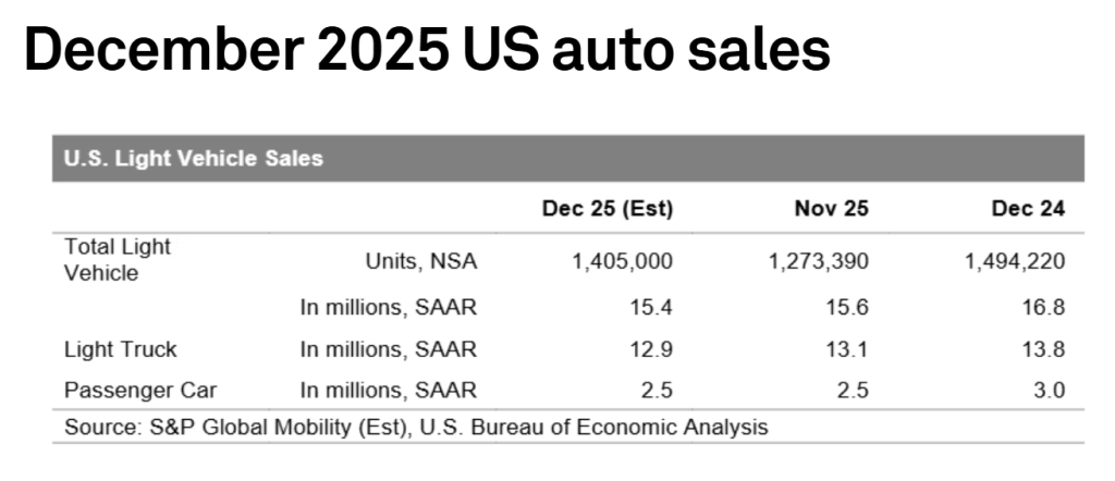 Auto Finance Sponsored by Auto Finance News US auto sales close year with lack of momentum Published: 5th January 2026 Share US auto sales ended 2025 on a subdued note, with December volumes projected at 1.4 million units, according to S&P Global Mobility. The estimate translates to a seasonally adjusted annual rate (SAAR) of 15.4 million units, matching the muted pace recorded in October and November and leaving the fourth-quarter average at the same level. The fourth quarter’s performance marks the slowest quarterly sales pace since the first quarter of 2023, signalling a cautious close to the year and an uneasy transition into 2026 for the automotive industry. Looking ahead, S&P Global Mobility forecasts US auto sales of 15.89 million units in 2026, representing a 2.5% decline from the projected 2025 total of nearly 16.3 million units. The outlook reflects a persistently uncertain operating environment, shaped by affordability pressures and evolving policy dynamics. “2026 brings with it mixed opportunities and uncertainty for the auto industry as we progress from the volatile, but relatively solid 2025 result,” said Chris Hopson, manager of North American light vehicle sales forecasting for S&P Global Mobility. “Unfortunately, the new vehicle affordability issues that have pushed against sustained momentum for US auto sales levels over the past two years remain entrenched. An already cautious consumer combined with potential OEM price adjustments translates to expectations that 2026 auto sales will decline from the 2025 level.” Affordability challenges, including elevated vehicle prices and financing costs, continue to weigh heavily on consumer demand, limiting the industry’s ability to regain stronger sales momentum despite improving supply conditions compared with recent years. Battery-electric vehicle sales face added uncertainty The outlook for battery-electric vehicle (BEV) sales has also become increasingly uncertain. S&P Global Mobility notes that auto policy implications stemming from the One Big Beautiful Bill Act (OBBBA) could further temper long-term growth in BEV demand. In the near term, BEV sales and market share are expected to soften. While BEV share rose steadily from July through September, a notable decline has been observed in early fourth-quarter data. As both automakers and consumers adjust to post-incentive conditions, BEV sales softness is expected to persist through the first half of 2026. BEVs are estimated to account for 6% of total US auto sales in December. Inventory levels tightened following a third-quarter surge, constraining early fourth-quarter market share. The December estimate suggests limited improvement from November levels. Challenging start to 2026 As the industry enters 2026, US auto sales are expected to remain under pressure from affordability constraints and shifting electric vehicle policies. While demand has proven resilient in recent years, S&P Global Mobility cautions that the combination of cautious consumers, pricing dynamics, and policy uncertainty will likely keep sales growth restrained in the near term. Lisa Laverick Editor - Finance Connect Sign up to our newsletter Featured Stories NewsGovernment launches ‘go electric’ campaign NewsTrends shaping mobility, logistics & manufacturing in 2026 NewsArval subsidiary Greenval insures 1m vehicles Auto Finance