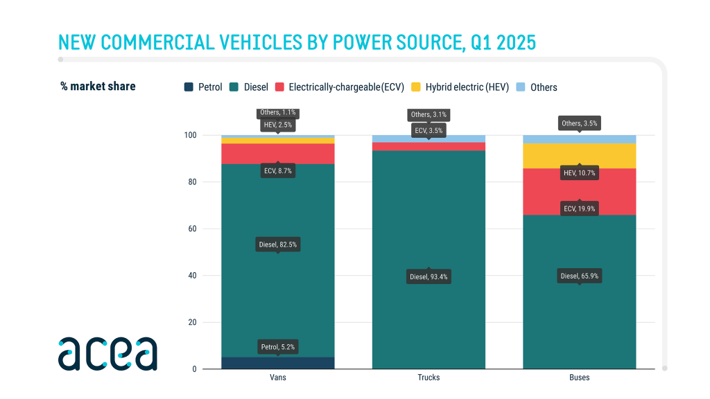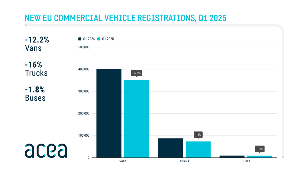 Auto Finance Sponsored by Auto Finance News EU new commercial vehicle market slumps in Q1 2025 Published: 30th April 2025 Share The European Union’s commercial vehicle market endured a difficult first quarter of 2025, with new registrations sharply declining across key segments, according to the latest data released by the European Automobile Manufacturers’ Association (ACEA). Sluggish economic growth, weak prior order intake, and regulatory uncertainty were cited as major headwinds for the industry. Van market takes a hit New van registrations in the EU dropped by 12.2% compared to the same period last year, with major markets contributing heavily to the downturn. Italy suffered the largest decline at -15.2%, while both France and Germany posted identical decreases of -10.7%. Spain was a notable outlier, with van registrations rising by 12.6%, providing a rare bright spot in an otherwise gloomy segment. Truck registrations plummet The truck market saw an even steeper fall, with new registrations down 16%, totalling 72,941 units. Heavy-truck sales, in particular, plunged by 16.6%, while medium-truck registrations declined 12.5%. All major EU markets recorded losses, led by Germany (-25.4%) and France (-17.6%), while Spain (-12.8%) and Italy (-9.4%) also contributed to the sector’s downturn. Bus sales slip slightly The EU bus segment experienced a modest decline of 1.8%, with 8,674 units registered in Q1 2025. Germany saw the most significant drop at -15%, followed by Italy (-7.3%) and Spain (-0.5%). France remained relatively stable with a 0.1% increase. However, some smaller markets saw explosive growth—Sweden (+189.9%) and Greece (+187.6%)—mainly due to large-scale electrification projects. Powertrain trends: electric gains ground Despite overall sales declines, the transition to cleaner vehicles gained momentum: Vans: Diesel remained dominant, accounting for 82.5% of new sales, though volumes fell 14%. Electrically-chargeable vans surged 32.6%, now making up 8.7% of the market—up from 5.7% a year ago. Hybrid van sales were largely flat at +0.7%. Trucks: Diesel trucks comprised 93.4% of the market, even as registrations fell 17.7%. Electrically-chargeable trucks posted strong growth of 50.6%, taking a 3.5% market share. The Netherlands was a standout performer, with a staggering 342.7% increase, representing a quarter of all electric truck sales in the EU. Buses: Electrically-chargeable bus registrations jumped 50.3%, with their market share growing to 19.9%. Germany led in volume (+118.9%), while Sweden’s numbers soared from 9 units in Q1 2024 to 237 this year. In contrast, hybrid bus sales dropped 28.7%, and diesel buses slipped 5.6%, now representing 65.9% of the market. Lisa Laverick Editor - Finance Connect Sign up to our newsletter Featured Stories NewsCorporate fleets drive EV uptake in Europe NewsICE vehicles still lead as EV interest grows, TARGOBANK study finds NewsZenobē expands North American fleet with Revolv acquisition Auto Finance