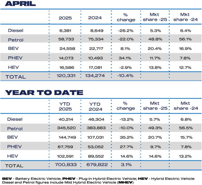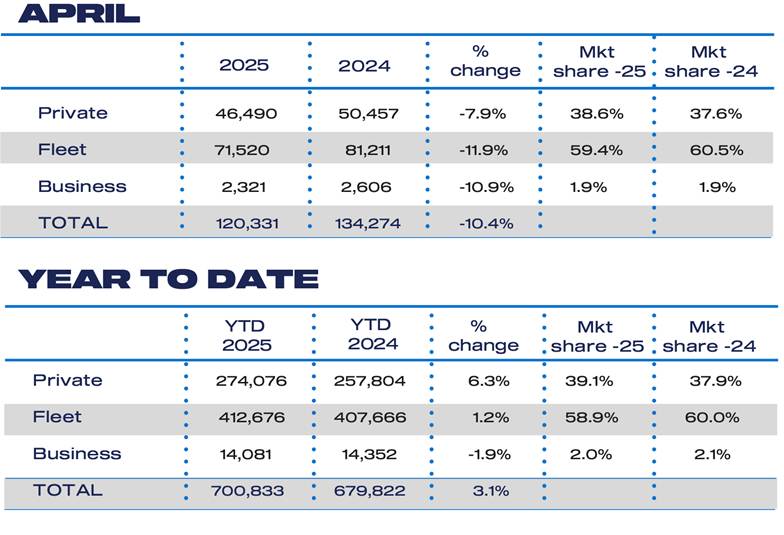 Auto Finance Sponsored by Auto Finance News UK new car market falls in April as tax changes bite Published: 6th May 2025 Share The UK’s new car market fell -10.4% in April, with 120,331 units registered, according to the latest data published today by the Society of Motor Manufacturers and Traders (SMMT). It was the sixth fall in the last seven months, reflecting a fragile economic backdrop and weakened consumer confidence, with 13,943 fewer cars registered in the month compared with the year before and 25.3% behind pre-pandemic April 2019. In what is traditionally a quieter month following the March plate change, volumes were also impacted by the late timing of Easter, resulting in fewer working days. In addition, the implementation of VED changes affecting all new cars, including the Expensive Car Supplement which became applicable to many new EVs from 1 April, pushed transactions into March as shrewd buyers got ahead of the tax increases. Registrations fell across all sales types, with private, fleet and business demand down -7.9%, -11.9% and -10.9% respectively. Continuing market trends, fleet buyers drove activity, responsible for six in 10 registrations. In terms of powertrain performance, demand for hybrid electric vehicles (HEVs) fell -2.9%, with petrol and diesel registrations down –22.0% and –26.2% respectively. Conversely, registrations of vehicles with a plug rose: plug-in hybrids (PHEV) up 34.1% and battery electric vehicles (BEV) increasing 8.1% to 24,558 units, taking more than a fifth (20.4%) of the market. There is now a huge range of BEVs on the market, with more than 130 models available – including an increasing number at lower price points – the result of massive investment by manufacturers to offer electric options for all consumers across all segments. Year-to-date the new car market is up 3.1% and, with new BEV registrations up 35.2% to push market share to 20.7%, these models are now the second most popular powertrain after petrol but still below the 28% required under market regulations. While the SMMT notes that the government’s recently proposed amendments to the Zero Emission Vehicle Mandate requirements are welcome – recognising the intense pressure on the sector – the targets remain incredibly challenging and more must be done to stimulate demand. The importance of government incentives to boost volumes remains paramount, according to the SMMT. Halving VAT on new EV purchases; scrapping, or amending, the VED Expensive Car Supplement; and equalising VAT paid on public charging to that levied at home would all help boost the market and send a strong signal to any hesitant buyers that now is the time to go electric. Mike Hawes, SMMT Chief Executive, said: “April’s performance is disappointing but expected after March’s surge. “Another month of growth for electric vehicle registrations is good news, however, even if demand remains well below ambition. Recent government adjustments to flexibilities and compliance within the ZEV Mandate are welcome and an important first step in relieving some of the pressure on the market and manufacturers. “However, EV uptake is still being heavily and unsustainably subsidised by the industry which is why a compelling package of measures from government is essential if consumers are going to make the switch.” The news comes as the latest market outlook revises up full year 2025 new car registrations to 1.964 million units but keeps 2026 expectations below the two million mark for what would be the seventh successive year. Market share expectations for new BEV registrations, meanwhile, remain fairly constant with only a marginal revision downward from the January view, by -0.2 percentage points to 23.5% for this year, and by -0.3 percentage points to 28% next year, compared with the ZEV Mandate targets of 28% and 33% respectively. Lisa Laverick Editor - Finance Connect Sign up to our newsletter Featured Stories NewsDF Capital partners with Fleet Auction Group NewsOctopus Electroverse and Freenow partner on EV charging discounts NewsKBC completes Czech and Slovak Business Lease acquisition Auto Finance
