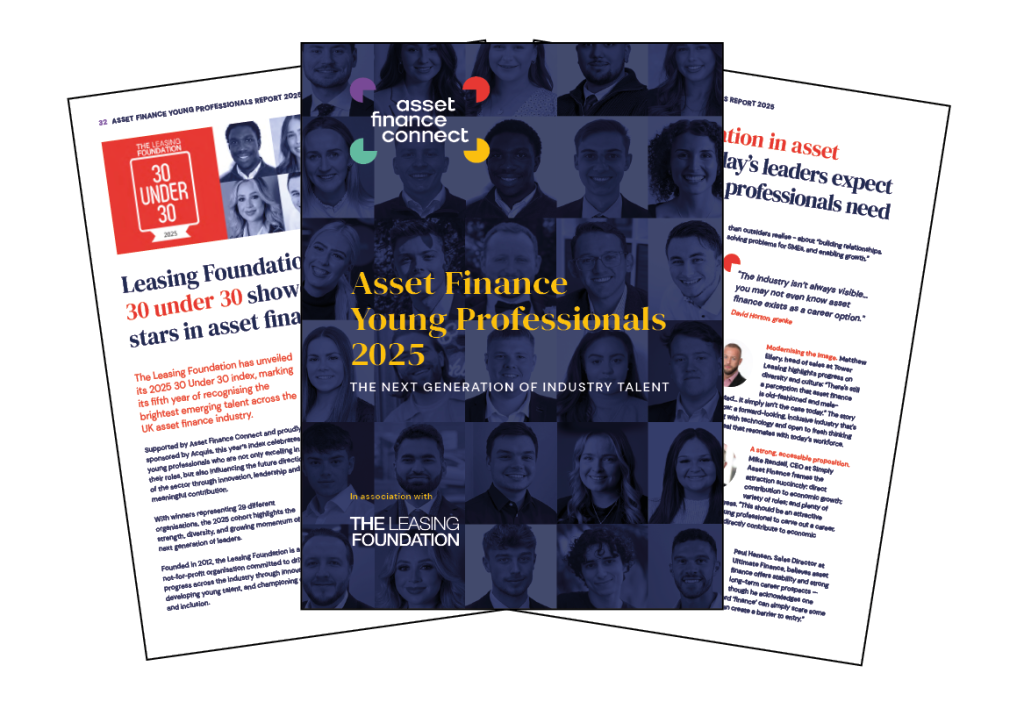 People Redefining the future of the asset finance industry Published: 25th November 2025 Share The 2025 edition of the Asset Finance Young Professionals Report shines a spotlight on the next generation shaping one of the financial sector’s most forward-looking industries. As asset finance continues to evolve through innovation, technology, and shifting workforce expectations, young professionals are not just adapting to change – they’re leading it. From redefining leadership and career pathways to embracing digital transformation, this year’s Report captures the ambition, resilience, and creativity driving asset finance forward. It celebrates achievement, explores emerging challenges, and sets out a roadmap for how the industry can continue to attract and empower exceptional talent. Key themes from the 2025 Report Celebrating the Leasing Foundation’s 30 Under 30 Class of 2025: This year’s Report showcases the outstanding individuals recognised in the Leasing Foundation’s 30 Under 30 Class of 2025, alongside reflections from the 2024 cohort and insights from senior leaders on supporting the next wave of professionals. The mindsets that drive success: In a feature sponsored by Acquis, Jo Thorn, Head of Sales UK, explores the qualities that define success in asset finance today — from resilience and adaptability to a commitment to continuous learning and collaboration. The power of networks and community: A year into their leadership roles, Alex McWilliams and Lauren McQuilken, Co-Leads of the Leasing Foundation’s Next Generation Network, share how peer support and community are shaping career journeys and inspiring future leaders. Understanding the “restless generation”: Riaan van Wyk of Barnett Waddingham examines shifting career expectations, the rise of job mobility, and the importance of well-being and flexibility in engaging younger professionals. Learning for the long term: Yusuf Laher from the Finance Education Centre discusses why specialist training and professional development remain critical to the sector’s long-term success. Celebrating excellence across generationsThe Report features reflections from Rising Star award winner Kevin Calkiewicz and Lifetime Achievement recipient Steve Bolton, who share guidance and perspective for future industry leaders. Looking ahead: In the 2025 Report, New Leaf Search explores how artificial intelligence and emerging technologies are reshaping financial services — and how the next generation is developing the skills to thrive in this fast-changing environment. What emerges is a portrait of an industry in transition – one defined by curiosity, adaptability, and purpose. The young professionals featured here are not only the future of asset finance; they’re redefining what it means to lead within it. Why you should read this report Whether you’re an established leader or an emerging professional, the Asset Finance Young Professionals Report 2025 offers valuable insights into the people and ideas shaping the sector’s future. It’s both a celebration of achievement and a call to action – to continue creating environments where young professionals can learn, lead, and flourish. Download your copy of the Asset Finance Young Professionals Report 2025 by completing the form on the right. Download paper