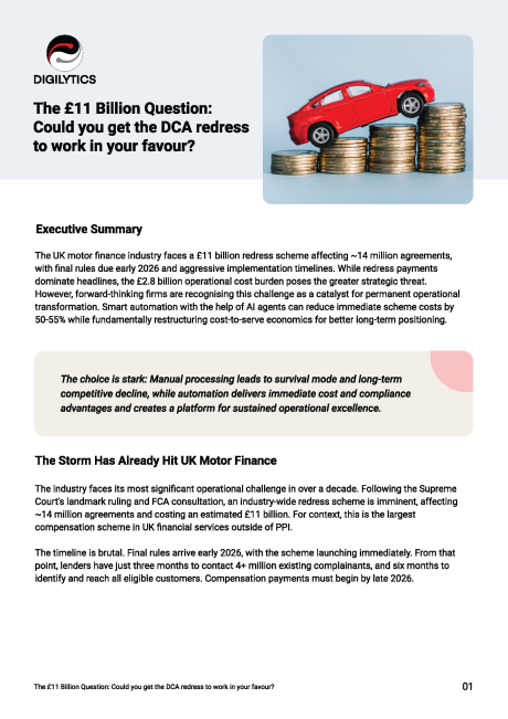 Discretionary Commission Crisis Discretionary Commission Crisis The £11bn question: Could you get the DCA redress to work in your favour? Published: 24th November 2025 Share The DCA redress scheme is moving faster than the industry can react, with final rules due in early 2026, millions of cases to process, and legacy data gaps that could cripple operations. The operational burden, not the payout, is the real threat: 14 million agreements, inaccessible data going back to 2007, and only months to execute once the scheme launches. The scale and complexity of what is coming will test even the best-prepared organisations. This whitepaper shows how lenders can turn this regulatory wave into an opportunity for efficiency, resilience, and long-term competitive advantage. What’s inside the white paper 1. A clear view of the operational reality Why the £2.8B processing burden, tight timelines, and legacy data gaps pose a greater threat than the £11B payout. 2. The uneven cost and capacity challenge across the industry Why certain lenders will face 2–3x higher per-case costs due to volume disparities, fragmented historical data, and limited in-house operational bandwidth. 3. The automation blueprint that cuts redress costs by 50–55% Covers AI-powered document extraction, agentic workflows, automated eligibility checks, calculation engines, and customer self-service. 4. How redress automation becomes a long-term strategic asset Shows how the same automation foundation strengthens originations, complaints management, collections, lifecycle servicing, and regulatory compliance. Want the full analysis? Get the complete white paper and learn how leading lenders are preparing for the 2026 deadline with AI-powered operational transformation. Download your complimentary copy. Download the Digilytics white paper now by completing the form on the right. Download paper