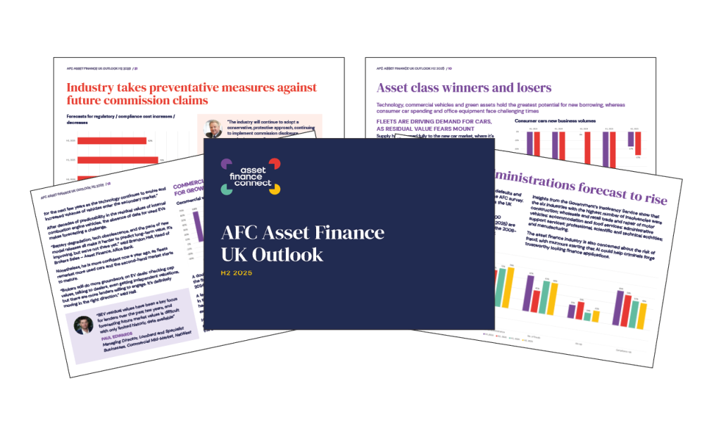 News UK asset finance navigates a challenging H2 2025 Published: 25th November 2025 Share Asset Finance Connect’s latest UK Asset Finance Outlook H2 2025 reveals an industry balancing strong liquidity and falling borrowing costs against weakening business confidence, tightening regulation, and rising operational pressures. The full report — available to download now — offers an in-depth analysis of confidence levels, asset-class performance, regulation, funding conditions, and emerging technology trends shaping the UK market in the second half of the year. Download your copy of the full report by completing the form on the right. Key findings include: Confidence weakened despite positive economic indicators: Rates are falling and inflation is easing, but policy uncertainty, rising costs and fears of future taxation are delaying business investment and slowing demand. Corporate lending takes the lead: Both lenders and brokers expect business customers—especially corporates—to drive borrowing, as the consumer market continues to contract. Liquidity strong, but risk discipline under pressure: Independents and captives are growing market share as banks remain cautious, raising concerns that intense competition could lead to looser credit decisions. Asset class divergence widens: Technology, cybersecurity, commercial vehicles and green energy assets show the strongest growth prospects, while consumer car finance and office equipment remain subdued. Regulation reshapes lender–broker dynamics: The Supreme Court ruling on commission disclosure has triggered widespread adoption of preventative disclosure and rising compliance costs. Defaults expected to rise: Lenders and brokers report their most pessimistic insolvency outlook since 2023. As-a-service models gain traction: Especially in IT hardware/software and green energy systems, reflecting a shift toward opex-based finance. The AFC UK Asset Finance Outlook H2 2025 captures a market defined by caution, selective growth opportunities and structural change – offering essential insights for navigating the months ahead. Download the UK Asset Finance Outlook H2 2025 now by completing the form and stay ahead of the trends reshaping the UK asset finance industry. Download paper