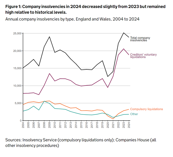 Market Data Sponsored by Market Data UK corporate insolvencies see slight decline in 2024 Published: 21st January 2025 Share The UK saw a modest decline in corporate insolvencies in 2024, offering a glimmer of hope for businesses grappling with ongoing economic pressures. Official figures from the Insolvency Service revealed 23,872 registered company insolvencies during the year—a 5% drop from the 25,163 cases recorded in 2023, which marked the highest annual total since 1993. Key corporate insolvency figures are: Total Insolvencies: 23,872 (down 5.1% from 2023) Creditors’ voluntary liquidations (CVLs): 18,840 (down 8% from 2023) Compulsory liquidations: 3,230 (up 14%, highest since 2014) Administrations: 1,597 (up 2%) Company voluntary arrangements (CVAs): 202 (up 9%) Receivership appointments: 3 Despite the decline, insolvency levels remain significantly higher than pre-pandemic averages, reflecting a tough environment for businesses. CVLs, though reduced from 2023’s record highs, continued to dominate insolvency cases, while compulsory liquidations surged, signalling growing impatience among creditors, including HMRC. Industry insights Theo Chatha, Chief Financial Officer at Bibby Financial Services, highlighted the sustained pressures on small businesses. “While insolvency rates dipped slightly in 2024, the numbers remain alarmingly high compared to the previous decade,” he said. Chatha warned of a “vicious cycle” in supply chains, with unpaid invoices and bad debt undermining business stability. Helen Martin, an insolvency expert at Stevens & Bolton, struck a cautiously optimistic note. “Today’s statistics provides a cautiously optimistic picture, with overall insolvencies down 5% on 2023 demonstrating that the country is finally getting over its Covid hangover. “But set against lower than expected growth in November and news today that UK employers cut staff numbers through the last quarter of 2024, businesses are not entering 2025 without challenges.” Martin pointed to construction, hospitality, and retail as the sectors most vulnerable to additional cost pressures, including increases in the minimum wage and national insurance contributions from April 2025. Tim Cooper, President of R3, the UK insolvency trade body, and a Partner at Addleshaw Goddard LLP, added context to the figures. “2024’s insolvencies have been driven by another year of high costs and a series of political, economic and geopolitical events which have taken a toll on businesses in England and Wales. Members have told us that the Election, the Budget and the conflict in the Middle East have all led to increases in enquiries and requests for advice and support, and this reflects how these unexpected shocks can be and have been the tipping point for many businesses after years of battling harsh trading conditions.” He emphasised that while CVLs have fallen, they remain elevated compared to pre-pandemic levels, as directors continue to proactively liquidate businesses under their control. Sectoral challenges and future risks The construction, retail, and hospitality sectors bore the brunt of insolvencies in 2024. Rising costs, cautious consumer spending, and adverse weather all played a role. The introduction of higher employer costs in April is expected to further strain these industries in 2025. On a more positive note, restructuring plans emerged as a significant development in 2024, with the Tasty plc ruling in May opening this process to mid-market firms. Cooper expressed hope that restructuring plans could become more accessible to SMEs: “The challenge the profession faces is making Restructuring Plans accessible to the SME market – and given the positive impact this could have on local communities and supply chains by keeping viable SMEs open, I hope it can be achieved this year.” Lisa Laverick Editor - Finance Connect Sign up to our newsletter Featured Stories Market DataPre-Budget uncertainty weighs on private sector outlook Market DataOne in three SME leaders lack cash flow understanding Corporate Member Market DataSmall businesses most at risk from tax rises in Autumn Budget