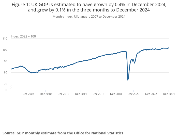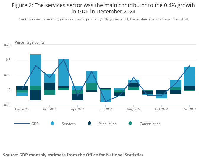Market Data Sponsored by Market Data UK economy shows unexpected growth at end of 2024 Published: 13th February 2025 Share The UK economy has shown a surprising uptick in growth at the end of 2024, according to new figures released by the Office for National Statistics (ONS). The data reveals that the economy grew by 0.1% in the last quarter of 2024, following a period of no growth in the previous three months. The ONS estimates that monthly real gross domestic product (GDP) grew by 0.4% in December 2024, a significant improvement compared to the 0.1% growth in November 2024 and a decline of 0.1% in October 2024. This growth was primarily driven by the service sector, which saw a 0.4% increase in output in December 2024. Despite the positive monthly figures, the overall annual GDP growth for 2024 was modest at 0.8% compared to 2023. The ONS also noted that while production output grew by 0.5% in December 2024, it fell by 0.8% over the three months to December 2024, largely due to a decline in manufacturing output. The construction sector experienced a slight decline of 0.2% in December 2024, following growth of 0.6% in November 2024. However, it still managed to grow by 0.5% over the three months to December 2024. Economists had been expecting a contraction in the last quarter of 2024, making this growth a welcome surprise. However, the ONS data also highlights ongoing challenges, including weak consumer confidence and the impact of recent budget measures on businesses and jobs. The ONS figures have provided some relief to the government, but the risk of a shallow recession remains, with future revisions potentially tipping the balance either way. George Lagarias, Chief Economist at Forvis Mazars commented on today’s figures: “December growth significantly surprising on the upside may be good news, but we wouldn’t pop the champagne just yet. The spectre of stagflation is very much alive. “The upside came mainly from the service sector, and in particular professional services. However, the more forward-looking January PMI data on British services suggest that orders remain soft, corporate risk aversion high and employment conditions are deteriorating. While we can’t totally dismiss a good growth number, we don’t think that it alone will move the needle for the Bank of England which is on a dovish path.” Lisa Laverick Editor - Finance Connect Sign up to our newsletter Featured Stories Market DataBank of England holds interest rates at 3.75% Corporate Member Market DataSME growth forecasts rise for first time since July 2024 Market DataMid-market firms drive optimism for 2026 as SME pressures persist