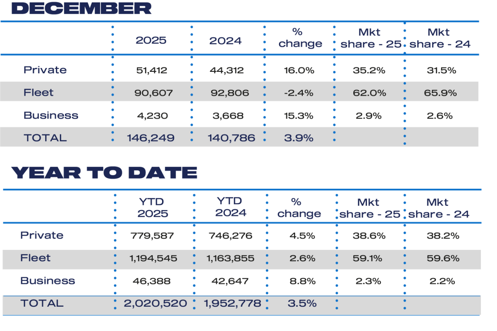 Auto Finance Sponsored by Auto Finance News UK new car market surpassed two million registrations in 2025 Published: 8th January 2026 Share The UK new car market surpassed two million registrations in 2025 for the first time since the pandemic, marking a third consecutive year of growth and underscoring the sector’s ongoing recovery. New figures from the Society of Motor Manufacturers and Traders (SMMT) show registrations rose 3.5% year on year to 2,020,520 units. Source: SMMT December delivered a strong finish, with registrations up 3.9% to 146,249 units. Private buyers drove much of the momentum, lifting their registrations by 16.0% in the final month. Battery electric vehicles (BEVs) also enjoyed a surge, taking 32.2% of the December market – the only point in 2025 at which the government’s 28% Zero Emission Vehicle (ZEV) mandate target was surpassed. Despite growing interest in electrified technologies, internal combustion engines (ICEs) remained the largest powertrain category in 2025. However, their dominance narrowed significantly, with ICE vehicles accounting for just 51.5% of the market as demand for hybrids, plug-in hybrids (PHEVs) and BEVs continued to accelerate. Across all buyer types – private, fleet and business – registrations rose. Private demand recovered modestly with a 4.5% increase to 779,587 units, though it still represented only 38.6% of the market. Fleet registrations were up 2.6% to 1,194,545, while business registrations rose 8.8% to 46,388. BEVs saw an especially significant boost in 2025. A total of 473,348 electric cars were registered – more than in 2021 and 2022 combined – pushing BEV market share to 23.4%. This places the UK on track to become Europe’s second-largest EV market by volume. Source: SMMT But the growth was still not fast enough to match regulatory expectations. The 23.4% share fell short of the 28% mandated for 2025, widening the gap between demand and ambition. Manufacturers have expanded electric model choice substantially – offering over 160 BEV models, with at least 60 more arriving in 2026 – but EV uptake grew only 23.9% last year. Much of the momentum has come at significant cost: carmakers subsidised EV sales by more than £5 billion in 2025, equating to around £11,000 per BEV. The government’s revived Electric Car Grant has provided some relief, though only a quarter of available models meet the eligibility criteria. Meanwhile, the planned eVED tax for EVs purchased from 2028 has sparked concerns that mixed policy signals could deter buyers. Average new car CO₂ emissions fell 10.1% to 91.8 g/km in 2025, helping some manufacturers move closer to compliance. However, 2026 will require BEVs to make up one in three new car registrations, a steep escalation that risks placing the UK out of step with major global markets. The EU is already considering pushing back its 2035 combustion engine phase-out date, raising the prospect of divergence between the UK and its largest trading bloc. The SMMT is urging government to bring forward its planned review of the ZEV Mandate to ensure the UK remains competitive, attractive to investors and aligned with long-term climate goals. Mike Hawes, SMMT Chief Executive, said: “The new car market finally reaching two million registrations for the first time this decade is a reasonably solid result amid tough economic and geopolitical headwinds. “Rising EV uptake is an undoubted positive, but the pace is still too slow and the cost to industry too high. Government has stepped in with the Electric Car Grant, but a new EV tax, additional charges for EV drivers in London and costly public charging send mixed signals. “Given developments abroad, government should bring forward its review and act urgently to deliver a vibrant market, a sustainable industry and an investment proposition that keeps the UK at the forefront of global competition.” Lisa Laverick Editor - Finance Connect Sign up to our newsletter Featured Stories NewsGovernment launches ‘go electric’ campaign NewsTrends shaping mobility, logistics & manufacturing in 2026 NewsArval subsidiary Greenval insures 1m vehicles Auto Finance