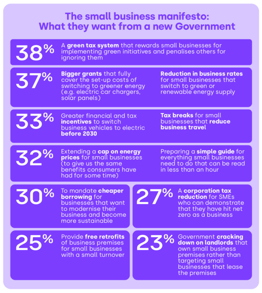 Market Data Sponsored by Corporate Member Market Data UK small businesses set sustainability agenda Published: 7th June 2024 Share Jo MorrisHead of Insight at Novuna Business Finance On the run up to the General Election on July 4th, small businesses across the UK are calling on the incoming government to prioritise sustainable and green initiatives. Research by Novuna Business Finance highlights the key demands made by small businesses. Small businesses want help from a new government on: Green tax system: 38% demand a green tax system that rewards small businesses for implementing green initiatives and penalises others for ignoring them. Reduced business rates: 37% call for a reduction in business rates for small businesses that switch to green or renewable energy supply. Increased grants: 37% highlight the necessity for larger grants that fully cover the set-up costs of switching to greener energy. Nationally, 94% of small business owners could point to specific areas where they needed help and finance concerns dominated – whether incentives, rewards for investing in green initiatives or preferable rates for funding. More generally, small businesses were also asked what green policies they hoped for from a new government and that would inspire them to take green issues more seriously. Amongst the top responses were, reducing single-use, plastic waste, increasing recycling and reducing littering (75%) and investing more in renewable power so the vast majority of the UK’s electricity is generated from renewables by 2030 (73%) – and support also for a substantial investment into the green economy (72%). The top 5 policies small businesses would like to see from a new Government With a General Election called for 4thJuly, the report by Novuna Business Finance – The Small Business Perspective on Sustainability – The Mandate for Support from a new UK Government – amplifies the continued and pressing demand for clarity amongst small business owners regarding the next Government’s stance on sustainability and mission towards Net Zero. Jo Morris, Head of Insight at Novuna Business Finance commented: “For the last three years, our research has shown the small business owners want to do more on sustainability and Net Zero, but they are looking for leadership, clarity, and consistency from the Government. “If bold moves are made on various green policies, small businesses say it will inspire them to also do more themselves on a range of green and sustainable initiatives. And more specifically, small business owners want financial support themselves from a new government – whether this takes the form of incentives or rewards for becoming more socially and environmentally conscious businesses. “This is not a flight of fancy; sustainable businesses are also strong businesses and good news for the UK economy.” Corporate Member Novuna Business Finance Novuna Business Finance provides business finance to SMEs and bigger corporations across the UK. This includes asset finance, stocking, block discounting and sustainable… View Profile All members Lisa Laverick Editor - Finance Connect Sign up to our newsletter Featured Stories Market DataPrivate sector still under pressure despite easing pessimism Market DataTwo fifths of SMEs can’t pay staff on time due to late payments Corporate Member Market DataEconomic volatility keeps UK small business owners awake at night